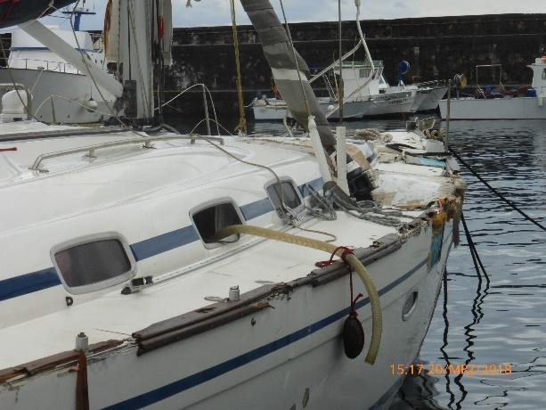 Uns schräg gegenüber lag eine Bavaria 50 aus Piräus, deren Segel zerfetzt am Mast hingen, das Vorstag fehlte, das Rigg notdürftig gesichert war, die Relings verbogen waren, im Deck an Steuerbord ein Riesenloch klaffte, die Holzscheuerleiste zerstört war und Pumpenschläuche aus den Fenstern hingen. Das Schiff war schlichtweg von vorne bis hinten demoliert.