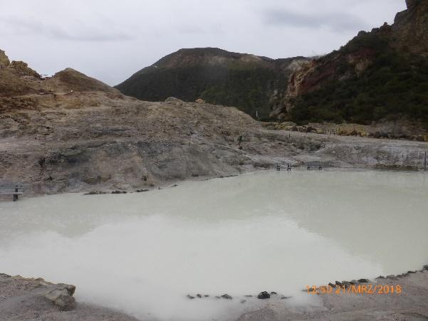 Wir nutzten einen Hafentag, um von Lipari mit dem Tragflügelboot nach Vulcano überzusetzen. Die Schwefeldämpfe der aktiven vulkanischen Quellen sind auf der ganzen Insel deutlich zu riechen. Gisbert war an Bord geblieben, der Rest der Crew wollte den Gipfel des Vulkans erklimmen. Da der Weg voller Geröll und steinig war, verzichtete Frank wegen seines kaputten Fußes auf den Aufstieg und blieb mit sich solidarisierenden Oli unten, während Andreas, Uwe und Achim den Berg bestiegen (ca. 2,5 h Fußmarsch hoch und runter), den Krater einmal umrundeten und die aufsteigenden Dämpfe und den Blick von oben bewunderten. Frank und Oli erkundeten den Bereich rund um den trostlosen Hafen und das nahe liegende heiße Schwefelbad.