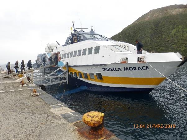 Es stellte sich dann heraus, dass der Fährverkehr wegen schlechten Wetters eingestellt worden war und es konnte niemand sagen, ob und wann noch eine Fähre fahren würde. Da die Insel ansonsten wenig zu bieten hatte, waren das keine guten Aussichten. Gottseidank lag im Hafen eine 53 Fuß Sun Odyssey, deren Skipper wir bereits unmittelbar nach der Ankunft bzgl. „woher“ und „wohin“ angesprochen hatten. Nun fragten wir an, ob die Crew uns nach Lipari mitnehmen könne, was sogleich und ohne Umschweife bejaht wurde. Die tschechische Crew, bestehend aus 10 Mann, brachte uns dann sicher nach Lipari zurück, versorgte uns unterwegs mit Bier und Schnaps und wir hatten nette Gespräche und konnten unser Englisch testen. Sie kamen von Sardinien, wollten Sizilien umrunden und nach Malta. Insgesamt rund 1.500 sm in 14 Tagen, inklusive Nachtfahrten. Leider hatten sie erhebliche Probleme mit Dieselpest im Tank und immer wieder notwendigen Filterwechseln (bereits 3 x) und Motoraussetzern. Wir revanchierten uns abends für den Transfer mit 2 Flaschen Rotwein, als wir zum Essen in der Stadt waren und das Schiff im Stadthafen erneut aufsuchten.