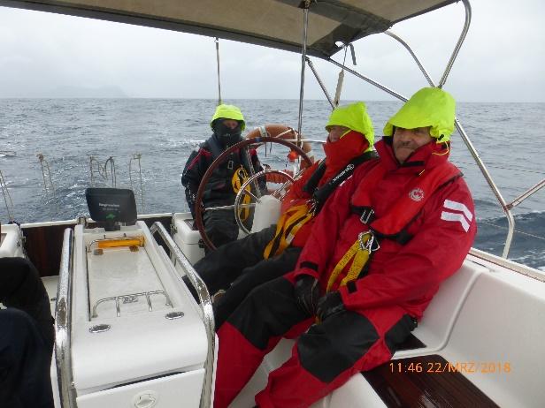 Danach dann endlich ablegen bei Windprognose von 5-6 Bft. aus West (gegenan). Während der Fahrt nimmt der Wind ständig zu und steigert sich bis auf 7 Bft., was erste Reffmanöver provoziert, so dass letztendlich nur die gereffte Fock übrig bleibt. Zudem ist es kalt und nass (Gischt). Die Wellenhöhe steigert sich ständig auf etwa 2 – 2,5 m, so dass die Hälfte der Crew unmittelbar seekrank wird. Die Wellen sind so stark, dass Frank unter Deck keinen Halt mehr findet, sich versucht am Tisch festzuhalten und mit diesem zusammenbricht. Alle Schrauben des Sockels (teilweise lächerlich kurz) sind aus den Bodenbrettern herausgerissen und der Tisch muss gesichert und ins Vorschiff transportiert werden. Bei dem Seegang ein mühevolle Aufgabe.