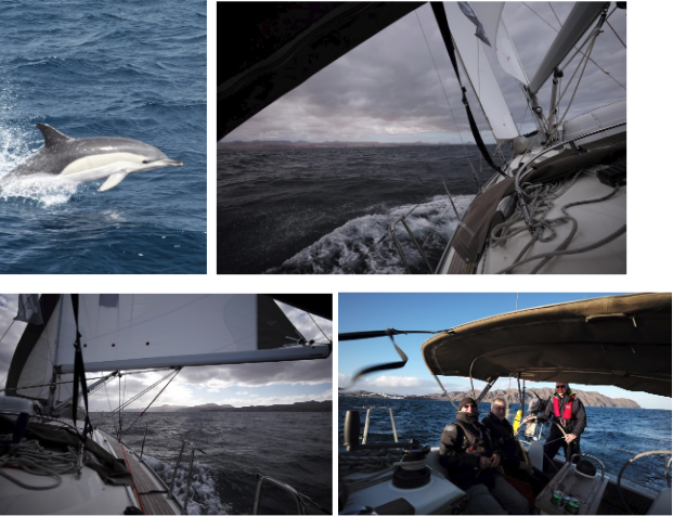 Wir haben achterliche Winde um die 16-18 kn (Bft. 5), müssen ständig den Großbaum schiften und per Bullenstander sichern und vermissen einen Ausbaumer für die ständig aufgrund des Seegangs einfallende Fock. Wir versuchen höher an den Wind zu gehen und vor dem Wind zu kreuzen, was aber auch keine wirkliche Besserung bringt und den Weg zudem verlängert. Die achterliche Welle um die 2.00 -2.50 m mit entsprechenden Gierbewegungen des Schiffes erzeugt erste Seekrankheit bei der Crew. Ab und an erwischt uns ein Regenschauer. Erste Delphinsichtungen, welche uns jedoch nur kurz begleiten. Aufgrund der langen Etappe und unserer mäßigen Fahrt nehmen wir ab und an den Motor zu Hilfe und lassen das Großsegel als Stützsegel stehen. Kurz vor dem Hafen erwischen uns noch einige kräftige Fallboen um die 27 kn (Bft. 6), so dass wir sogar noch einmal reffen müssen. Im Surf auf den Wellen erreichen wir maximal 9,3 kn Fahrt. Mit den letzten Sonnenstrahlen laufen wir gegen 18.30 Uhr in Gran Tarajal ein, nachdem auf unsere Funkanrufe leider keiner reagiert hat. Dennoch kommt ein Marinero und weist uns ein. Danach kurzer Fußmarsch in die nahe Stadt mit Einkauf im Supermarkt und anschließendem Essen in einer Pizzeria.