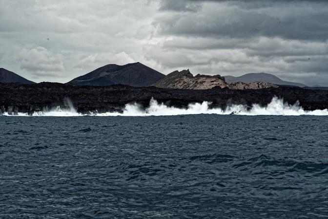 Die anderen Yachten haben am Vortag eine Yardstick Wettfahrt rund um die Islas Los Lobos und zurück nach Rubicon gemacht, an welcher wir aufgrund unseres Abstechers nach Fuerteventura nicht teilgenommen hatten. Nun stand eine weitere Wettfahrt an und nach dem morgendlichen Skipperbriefing startete das Team des Führungsschiffes die Wettfahrt gegen 10.30 Uhr kurz hinter dem Hafen bei schwachem Wind um 3 Bft. Aufgrund des schwachen Windes, der zudem auch noch von vorne kam, wurde die Wettfahrt um 11.45 Uhr abgebrochen und wir fuhren unter Motor die Westküste von Lanzarote und der Hoffnung auf Zunahme des Windes hinauf. Aufgrund offenbar starker Winde auf dem westlichen Teil des Atlantiks stand hier noch eine beachtliche Restdünung von 5-6 m Höhe mit entsprechenden Fahrstuhlfahrten des Schiffes bei jedoch sehr langer Wellenlänge. Die hohe Dünung brach sich an den Felsen der Steilküste und entlud sich explosionsartig in hoch reichenden Gischtwolken.