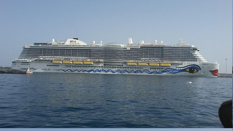 Draußen erwarten uns dann Böen mit bis zu 42 kn (Bft. 9). Das Schiff krängt schon ohne Segel mit bis zu 10°/15°. Wir setzen das 2-fach gereffte Groß und fahren in Richtung Startlinie. Das Schiff läuft in schweren Böen mehrfach aus dem Ruder und muss durch Rauslassen des Großsegels wieder eingefangen werden. Harte Arbeit! Alle Schiffe kämpfen schwer mit dem Wind, dennoch erwischen wir nahezu einen Nullstart bei Mittelwind um Bft. 6-7, rollen nach dem Startsignal zusätzlich einen kleinen Teil der Fock aus und laufen mit guter Höhe und Fahrt den anderen Yachten davon. Der Wind nimmt hinter der Nordspitze Lanzarotes immer weiter ab, so dass wir nach und nach das Groß und dann auch die Fock ausreffen. Wir liegen nach wie vor an der Spitze des Feldes, jedoch schläft der Wind nach und nach ein, bis er so schwach ist, dass wir nicht einmal mehr eine Wende hinkriegen. Wir fragen über Funk nach, wie lange das so weitergehen soll? Nach kurzer Überlegung entscheidet sich die Wettfahrtleitung für einen Abbruch und gegen 11.15 Uhr gehen die Motoren an und leider bis Arrecife auch nicht mehr aus. Wir laufen nach Anmeldung über Funk gegen 14.00 Uhr in den Hafen ein, bewundern kurz die Größe der an der Pier liegenden (hässlichen) AIDA Nova und legen gegen 14.30 Uhr bei totaler Flaute am Steg des Vercharterers an.