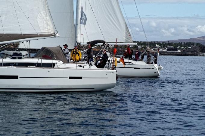 Da wir die Schiffe um 16.00 Uhr in Arrecife zurückgeben mussten, blieb nichts weiter übrig als dennoch mit allen Schiffen den Hafen gegen 8.20 Uhr zu verlassen. Gleichzeitig sollte eine letzte Wettfahrt stattfinden. Alleine das Ablegemanöver war bei dem seitlichen Starkwind schon ein Abenteuer, gelang uns aber nach Eindampfen in die Achterleine mit 2.300 UPM und Bugstrahlruder unerwartet problemlos. Wir haben jedoch vorher auch ein wenig über die Methodik gegrübelt und uns Abhaltehilfe für Notfälle herangeholt.